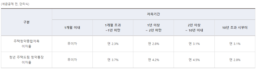 주택청약종합저축과 청년 주택드림 청약통장의 단리식 이자율 비교표입니다.